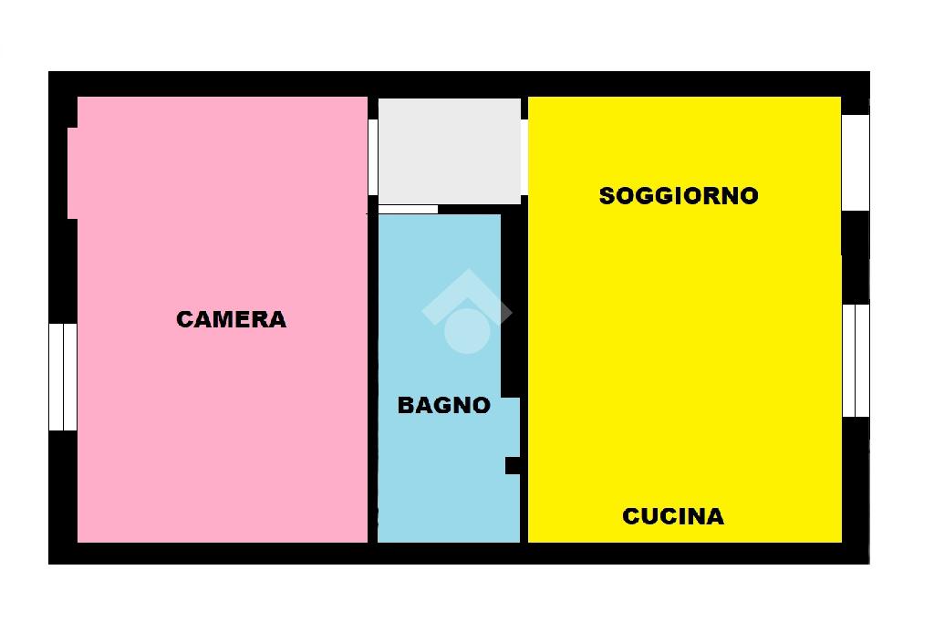 L'ingresso si apre su una zona giorno open space con cucina a vista. Un comodo disimpegno conduce alla camera da letto matrimoniale e al bagno, dotato di box doccia.